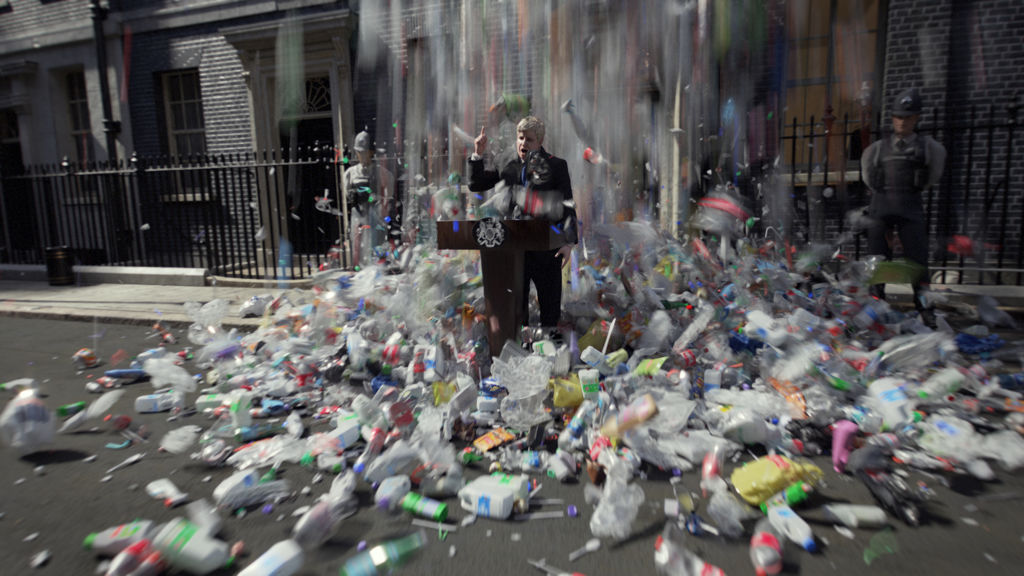 The two minute film, called Wasteminster, was created through Park Village, alongside artists Studio Birthplace and their CGI partners Method & Madness, and directed by Jorik Dozy and Sil Van Der Woerd. The team built an exact digital replica of Downing Street and, using library photographs and satellite imagery, they went into incredible detail, right down to the light fittings. CG Director Alex Scollay and his team used the power of a bespoke VFX data simulation, high-end CGI and modelling to create the dynamic flow of 1.8 million kilograms of plastic, with the individual items of plastic interacting with each other in a physically accurate manner thanks to ‘Tyflow’ software.