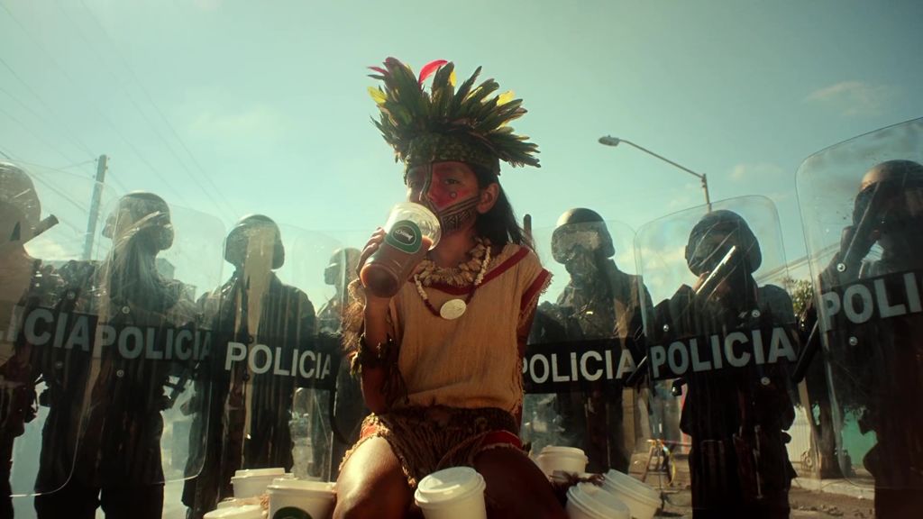 Violence was the defining feature of This Is America, and dominates the new video too, albeit filtered through a prism of protest: riot shields, tear gas, defiant mobs facing off against the police, tribal woman pairing their traditional garb with ski masks and guns – intercut with subtler messages of resistance, including an indigenous child toting the elaborate feathered headdress of Aztec emperor Montezuma, standing on piles of Starbucks cups and Amazon boxes, reminiscent of a pyramid of skulls.