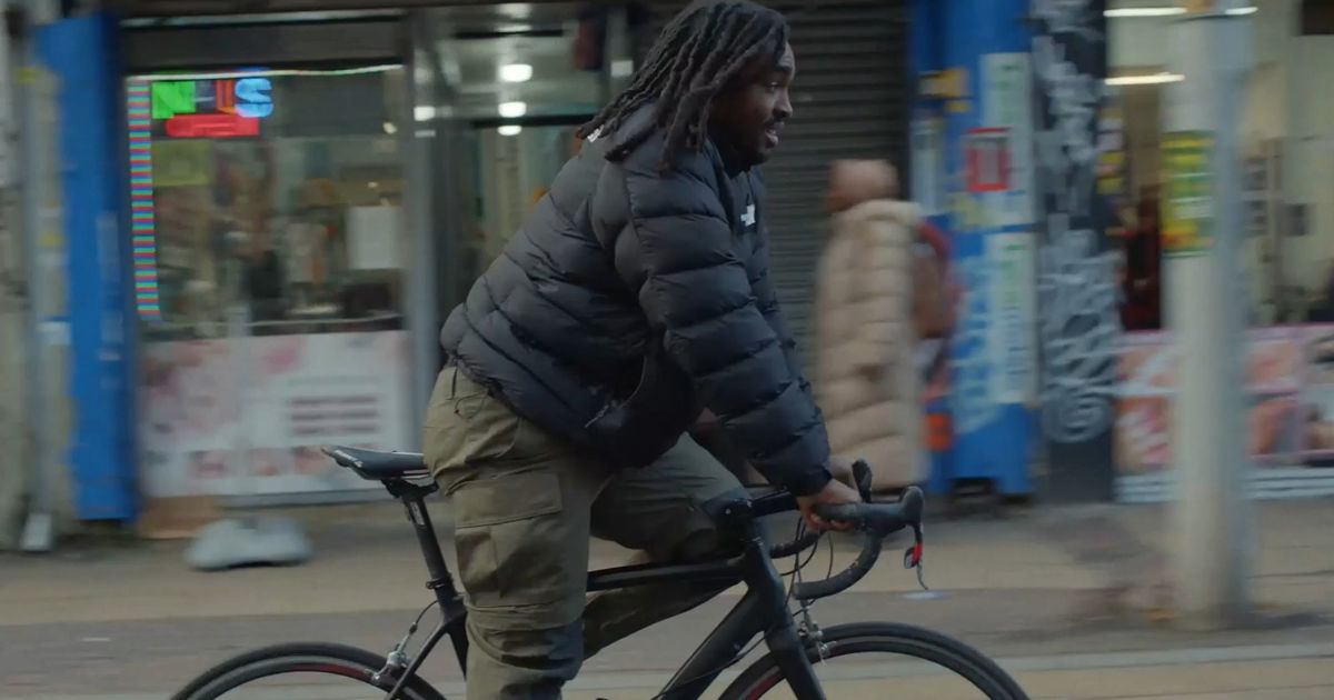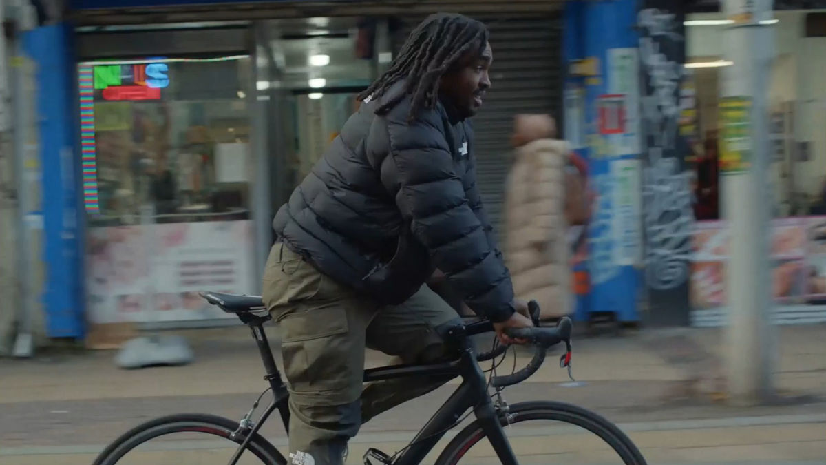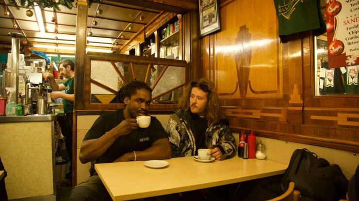 Gustav Newby cycle couriering DP Thom Neal around as he films Hak Baker's bike odyssey. Plus, Baker and Armon-Jones in E Pellicci's cafe on Bethnal Green Road, East London.