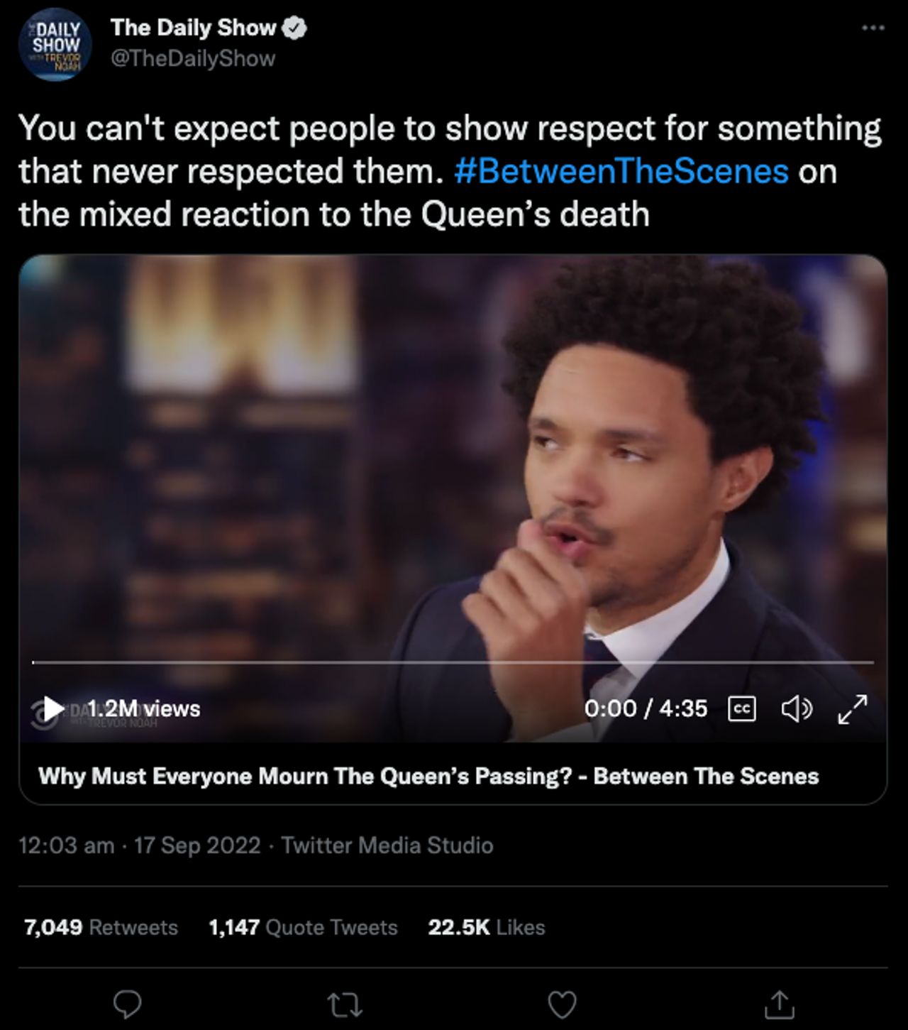 Tone policing took place after the Queen’s death. Monarchy apologists chose to ignore the centuries of pain and hurt and murder and colonial theft because… a tweet wasn’t nice? Yeeeaaaaaah. That’s the same. But, as Trevor Noah said so succinctly and irrefutably, in a monologue on the Daily Show: “You can't expect people to show respect for something that never respected them.”