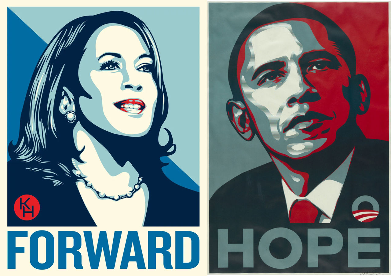 Above: Artist Shepard Fairey created FORWARD for Kamala Harris's presidential campaign, and HOPE, which helped Obama win the 2008 presidency.